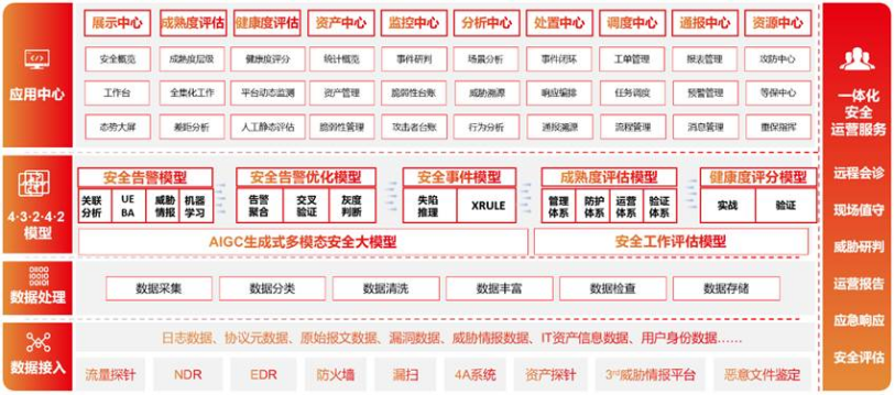 借助云端智能中枢,将安全SaaS、安全运营、AI智能分析、威胁情报、专家经验等融合封装,面向客户实际应用场景,提供多元化安全服务能力。
