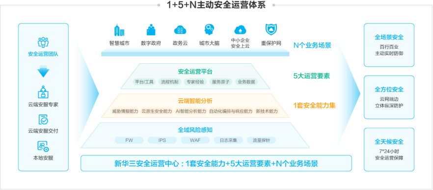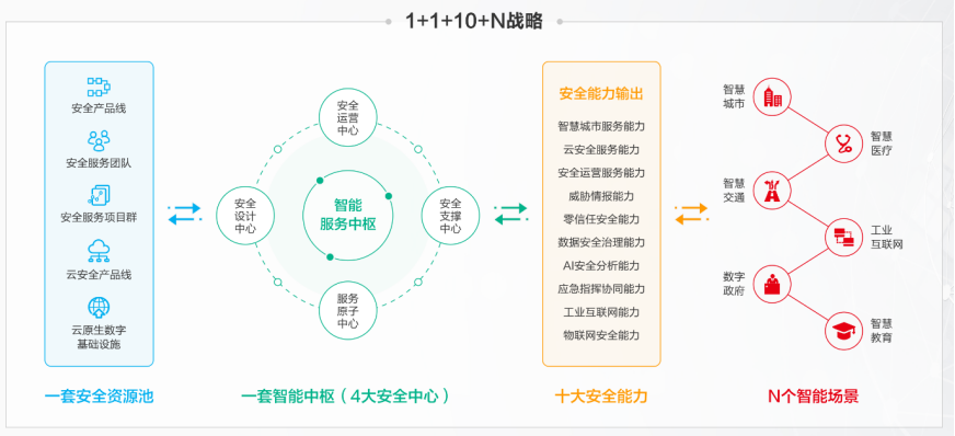 新华三安全服务立足于客户实际需求,结合新华三整体战斗力、云原生安全能力、新技术能力等“1套安全资源池”,通过“1套智能中枢”(4大安全中心),整合工具、平台、解决方案、管理手段、安全服务及专家经验等能力,运用业务场景化安全思维,面向客户“N个实际智能应用场景”提供多元化、宽领域的“10大安全能力输出”,协助客户构建自身安全能力,达到能力共建的目标。
